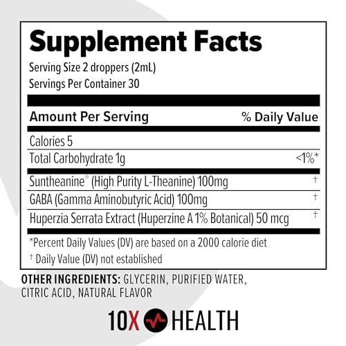Suporte Natural ao Sono: A L-theanine e o GABA promovem a calma para um sono melhor, enquanto o Huperzine A auxilia na função cognitiva. As gotas líquidas 10X Calm L-theanine oferecem suporte natural ao sono tranquilo, sendo perfeitas para inquietação e rotinas irregulares.