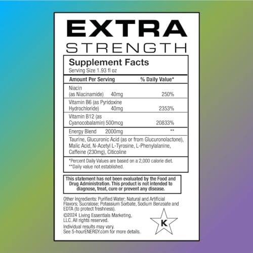 Consuma um shot de 5-Hour Energy Extra Strength quando precisar de um impulso de energia. Não exceda o consumo de dois shots em um período de 24 horas. Agite bem antes de consumir. Não recomendado para menores de 18 anos, mulheres grávidas ou lactantes, ou pessoas sensíveis à cafeína. Consulte um médico antes de usar se tiver alguma condição médica ou estiver tomando medicamentos.