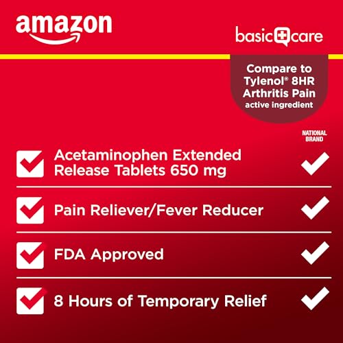 Os comprimidos de liberação prolongada Amazon Basic Care Acetaminophen, 650 mg, são uma opção eficaz para o alívio temporário da dor causada pela artrite. Cada comprimido contém 650 mg de acetaminofeno, o ingrediente ativo, que é comparável ao ingrediente ativo do Tylenol 8HR Arthritis Pain. Além de aliviar a dor da artrite, este produto também pode ser usado para aliviar dores musculares, dores nas costas, cólicas pré-menstruais e menstruais, resfriados comuns, dores de cabeça e dores de dente. Os comprimidos são livres de aspirina e glúten, tornando-os adequados para pessoas com sensibilidade a essas substâncias. A embalagem possui uma tampa de pressionar e girar, que é resistente a crianças. Este produto destina-se a adultos e não é recomendado para menores de 18 anos, a menos que sob orientação médica.