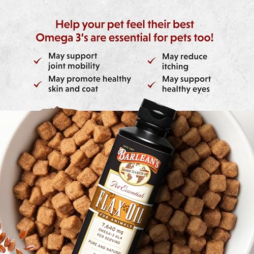 Barlean’s Flaxseed Oil for Animals é um suplemento líquido essencial de ômega 3 para animais de estimação, especialmente desenvolvido para cães e gatos. Este óleo de linhaça prensado a frio é uma fonte abundante de ácidos graxos ômega-3, que são essenciais para a saúde e o bem-estar de todos os animais de estimação. O óleo de linhaça da Barlean melhora a saúde e a mobilidade das articulações e ossos, a saúde dos olhos e da pele, a qualidade e o brilho da pelagem, além de contribuir para a saúde e qualidade do leite em animais lactantes.