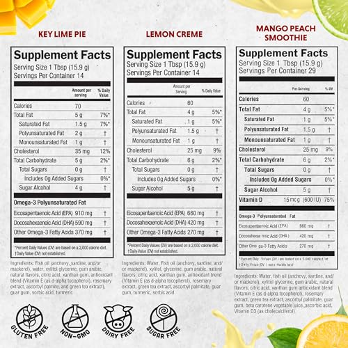 Barlean’s Omega 3 Fish Oil Liquid Supplement Pack of 3 is a delicious and nutritious way to incorporate essential fatty acids into your daily routine. With its yummy fruity flavors and creamy smoothie texture, both kids and adults will love this fish oil supplement. The pack includes three flavors: Key Lime Pie, Lemon Crème, and Mango Peach, each providing a different dosage of EPA/DHA essential fatty acids per serving. The Mango Peach and Lemon Crème flavors offer 1080mg, while the Key Lime Pie flavor provides 1500mg. This supplement is dairy-free, sugar-free, non-GMO, and free from artificial flavors, colors, and sweeteners.