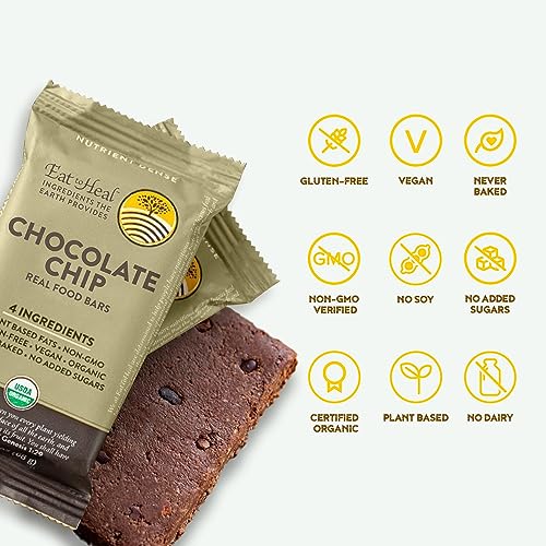 INDULGE IN WHOLESOME GOODNESS: Eleve sua experiência de lanche com as barras de chocolate com gotas de chocolate EatToHeal, lanches veganos saudáveis sem culpa que atendem ao seu desejo por doces, mantendo o compromisso com ingredientes orgânicos, não transgênicos, sem glúten e à base de plantas. Essas barras de lanche saudáveis são elaboradas para oferecer um sabor delicioso e nutritivo de barra de chocolate que está alinhado com suas escolhas conscientes de dieta e nunca são assadas.