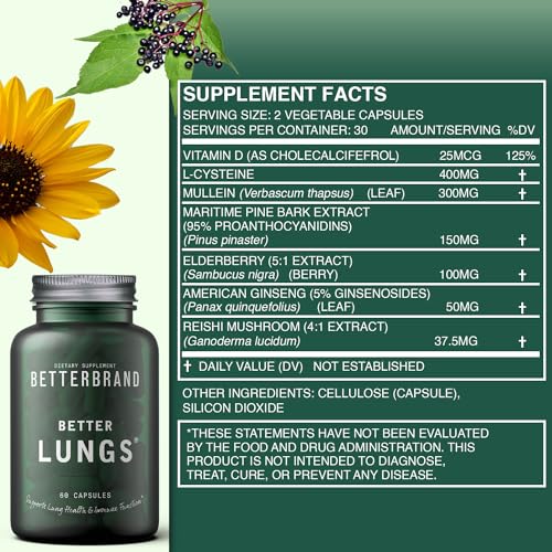 BetterLungs is formulated with natural ingredients such as Vitamin D, L-Cysteine, Mullein Leaf, Pine Bark, Elderberry, Ginseng, and Reishi Mushroom. These ingredients work together to support lung health all year long. BetterLungs is a reliable supplement that provides the necessary nutrients to promote respiratory well-being.