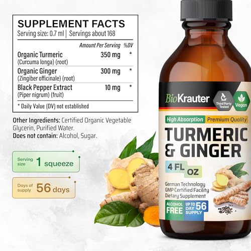 Turmeric and Ginger Tincture for Immunity: Os suplementos de cúrcuma e gengibre da BioKrauter, feitos a partir de Curcuma longa e Zingiber officinale, apoiam a imunidade e promovem a saúde das articulações.