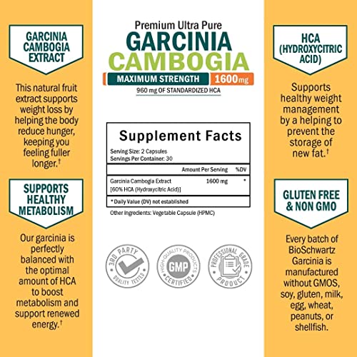 Fórmula de Máxima Potência – A Garcinia Cambogia da BioSchwartz é um poderoso suplemento para perda de peso, contendo 1600mg de Garcinia Cambogia 100% pura com 960mg de HCA padronizado por porção*.