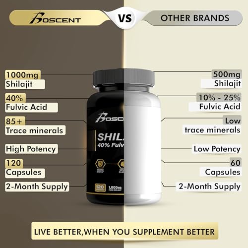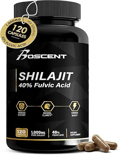 Estimulante Natural de Energia: O suplemento de shilajit da Boscent foi projetado para aumentar naturalmente sua vitalidade, ajudando você a se manter focado e energizado ao longo do dia. Nosso shilajit puro contém mais de 58 minerais traços para apoiar seu sistema imunológico e digestão. Estudos mostram que as cápsulas são melhores do que a resina de shilajit, possuindo muitos benefícios e sendo comumente usado como suplemento alimentar para imunidade, suporte energético e bem-estar geral.