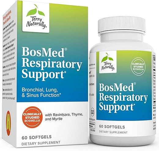 Conheça o Terry Naturally BosMed Respiratory Support, um suplemento herbal para suporte respiratório que promove a saúde dos pulmões e das vias respiratórias. Este suplemento é especialmente formulado para adultos que desejam melhorar a função bronquial, pulmonar e sinusal, sem causar sonolência ou nervosismo.