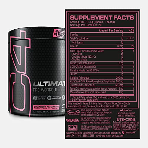 Comece seu treino definitivo com 300 mg de cafeína. O Cellucor C4 Ultimate Pre Workout Powder Watermelon fornece a energia necessária para enfrentar os treinos mais intensos e desafiadores. Com este suplemento, você estará pronto para superar seus limites e alcançar resultados incríveis.
