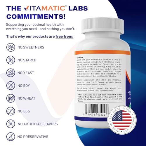 O Vitamatic Calcium Magnesium Zinc D3 Boron é um suplemento premium de alta qualidade, livre de organismos geneticamente modificados (Non-GMO) e sem glúten. Cada frasco contém 365 comprimidos revestidos, proporcionando uma fonte completa de nutrientes essenciais para a saúde.