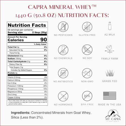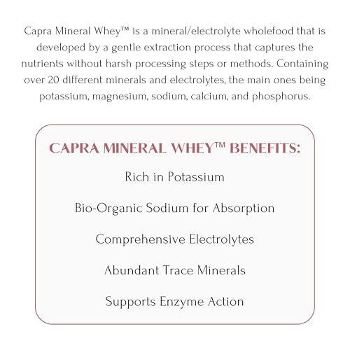 Capra Mineral Whey é um suplemento alimentar em pó feito a partir do soro de leite de cabra, que é fonte de minerais e eletrólitos essenciais para o corpo. Sua fórmula é alcalina e suave para o trato digestivo, sendo facilmente digerida e absorvida pelo organismo. Os minerais presentes estão em uma forma bio-disponível, o que significa que são facilmente utilizados e absorvidos pelo corpo.