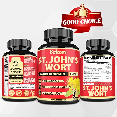 Satoomi St. John’s Wort Capsules Extract Supplement 5050mg – 90 Veggie Caps 3-Month Supply – Ashwagandha Root, Turmeric Curcumin Root, Passion Flower