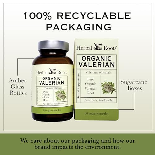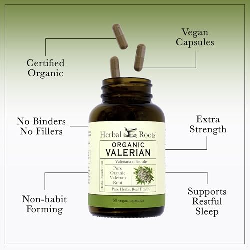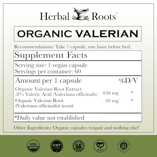 Herbal Roots Pure Organic Valerian Root Capsules – 900 mg – Non-Habit Forming with no Melatonin, Non-GMO – 60 Count Vegan Capsules, Herbal Supplement
