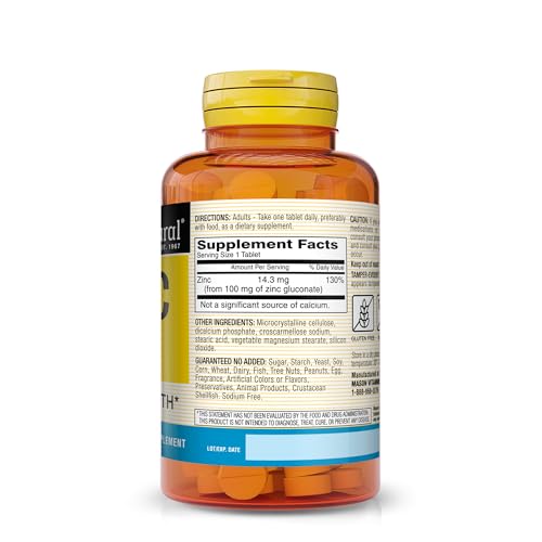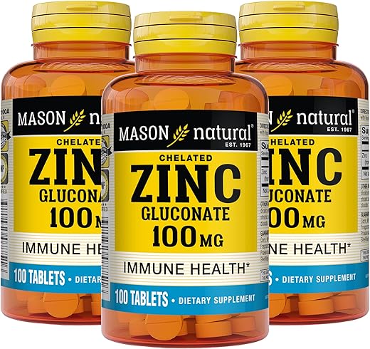 Mason Natural Zinc 100 mg Capsules Advanced Immune System é um suplemento mineral essencial que contém 450% do Valor Diário de zinco. Essas cápsulas de 100 mg utilizam uma forma do mineral conhecida como gluconato de zinco, que pode fornecer uma proteção antioxidante potente contra radicais livres tóxicos. Garantido sem adição de açúcar, amido, soja, milho, trigo, laticínios, fragrância, levedura, ovo, peixe, nozes, amendoim, crustáceos, corantes ou sabores artificiais. Livre de sódio.