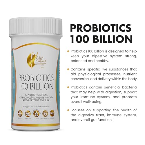 O Coco March Probiotic 100 Billion – 10 Probiotic Strains, Acid-Resistant Formula High Potency for Adults é um suplemento probiótico que oferece uma série de benefícios para a saúde. Com uma fórmula resistente ao ácido do estômago, este probiótico é projetado para sobreviver ao ambiente ácido do trato gastrointestinal e amplificar a colonização das cepas benéficas no intestino.