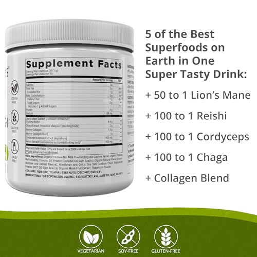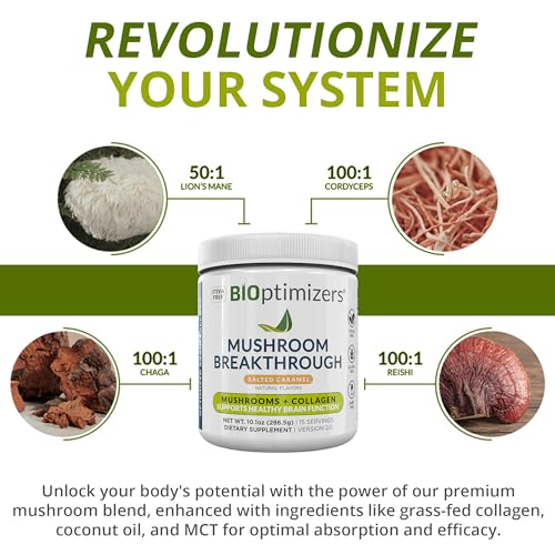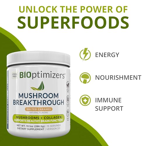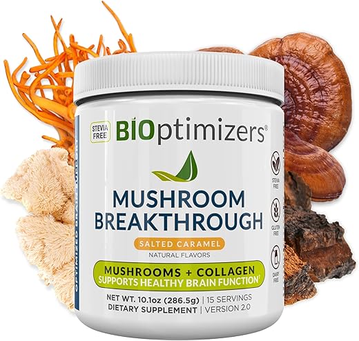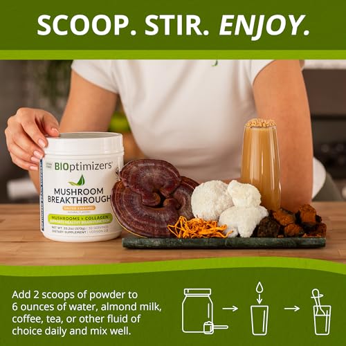 Misture 2 colheres de BiOptimizers – Mushroom Breakthrough – Salted Caramel – Nootropic Supplement Blended Powder of Mushroom, Collagen com 180 ml de água, leite de amêndoa ou sua bebida preferida. Consuma pela manhã para obter um impulso de energia duradouro. Não exceda a dose recomendada.