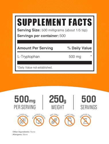Elevate sua saúde geral e bem-estar com o Pó de L-Triptofano da BulkSupplements.com – L-Triptofano 500mg, Suplemento de Triptofano – Suplemento de Aminoácidos, Livre de Glúten, 500mg por Porção, 250g (8.8 oz) (Pacote de 1). Nosso pó de L-Triptofano é projetado para apoiar sua saúde geral, sendo o complemento perfeito para qualquer estilo de vida. Embalado com nutrientes essenciais, ele foi desenvolvido para impulsionar seu bem-estar, mantendo você se sentindo no seu melhor dia após dia.