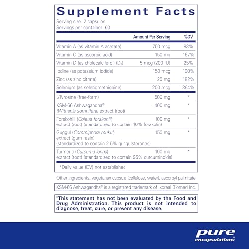 O Thyroid Support Complex da Pure Encapsulations é uma combinação de vitaminas, minerais e extratos herbais para promover a saúde ideal da tireoide*. Este suplemento suporta a síntese e o metabolismo dos hormônios da tireoide com a presença de iodo, L-tirosina e ashwagandha*. Além disso, contém vitamina A, C, selênio e cúrcuma para fornecer uma infusão antioxidante e apoiar o funcionamento do metabolismo celular da tireoide*. Recomenda-se tomar 2 cápsulas diariamente, com uma refeição. Os produtos da Pure Encapsulations são livres de alérgenos comuns, ingredientes artificiais ou desnecessários e organismos geneticamente modificados (OGMs), garantindo a qualidade e a pureza do produto.