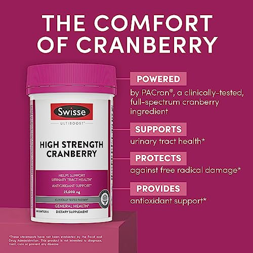 Swisse Cranberry Pills for Women é um suplemento alimentar projetado para apoiar a saúde do trato urinário em mulheres. Comumente utilizadas como pílulas para infecção urinária em mulheres, essas cápsulas de extrato de cranberry também podem ser usadas por homens. Cada cápsula contém 500mg de extrato de cranberry de alta potência, fornecido pelo PACran, uma forma em pó única desse extrato.