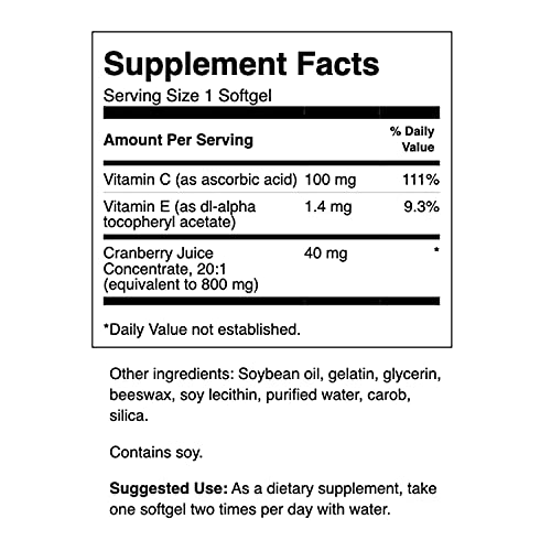 FORMULA PODEROSA: Com concentrado de suco de cranberry 20:1 (equivalente a 800mg), este poderoso suplemento de suco de cranberry também fornece 100mg de vitamina C e 1,4mg de vitamina E, tudo embalado em uma cápsula fácil de engolir para qualidade e conveniência.