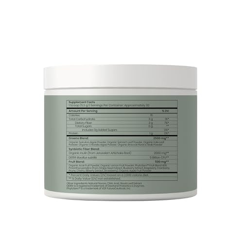 Nutrição direcionada – Nós cuidadosamente desenvolvemos este pó superalimento de vegetais verdes para ajudar a apoiar a saúde do seu intestino, imunidade e digestão. Ele contém uma mistura prebiótica e probiótica, utilizando Bacillus subtilis para promover uma flora intestinal estável e saudável, e inulina prebiótica para aliviar suavemente a irregularidade.