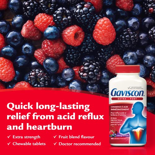Com sua embalagem de 60 comprimidos, o Gaviscon Extra Strength Fruit Antacid é conveniente para uso diário e fácil de transportar.