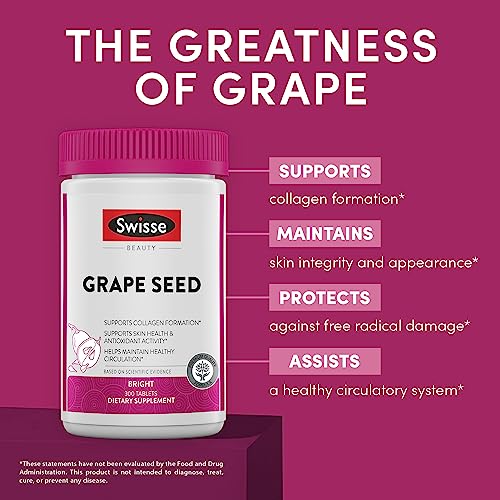 Swisse Grape Seed Extract Capsules é um suplemento herbal antioxidante que contém extrato concentrado de semente de uva. Cada cápsula contém 14130 mg de extrato de semente de uva, que suporta a circulação e a saúde cardiovascular. As sementes de uva ricas em nutrientes também ajudam a promover a saúde dos capilares e a circulação sanguínea. Além disso, o extrato de semente de uva é uma fonte rica de bioflavonoides (polifenóis) com efeito antioxidante significativo quando combinado com vitamina C. A vitamina C desempenha um papel fundamental na formação do colágeno, que é essencial para a saúde dos tecidos conectivos. Além disso, a vitamina C é um antioxidante que ajuda a proteger contra danos causados por radicais livres provenientes da poluição e toxinas ambientais.