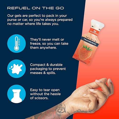 O Transcend Foods Mini Strawberry Gel é um gel energético de carboidratos de ação rápida, projetado para fornecer um impulso imediato de energia. Cada embalagem contém 24 sachês de 0,6 oz, perfeitos para ajudar os clientes a recuperar rapidamente seu desempenho máximo e gerenciar seus momentos de baixa energia.