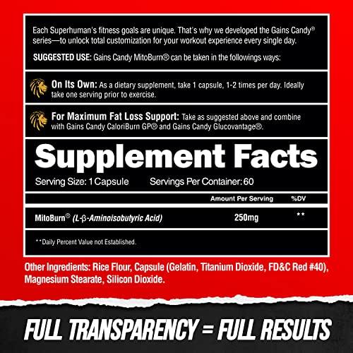 O principal ingrediente das cápsulas de dieta Gains Candy MitoBurn é o MITOBURN: a ÚNICA dose científica de MitoBurn, a primeira forma verificada e confiável de L-BAIBA (um aminoácido encontrado em plantas e animais). Esse novo ingrediente revolucionário se tornará seu melhor amigo para incinerar a gordura indesejada.