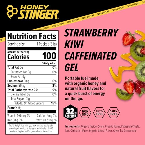 Consuma um gel energético Honey Stinger Organic Strawberry Kiwi Energy Gel | Caffeinated cerca de 15 minutos antes do exercício físico para obter um impulso de energia rápido e sustentado. Durante atividades de longa duração, consuma um gel a cada 45-60 minutos para manter os níveis de energia elevados. Lembre-se de sempre beber água ao consumir o gel para garantir uma hidratação adequada.
