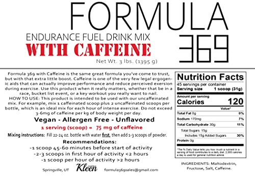 O Formula 369 com CAFEÍNA é uma mistura de bebida energética para resistência, disponível em um saco de 3 libras com 45 porções. Cada porção contém 30g de carboidratos, 75mg de cafeína e 170mg de sódio. A fórmula de carboidratos duplos contém uma proporção de 1:1 de glicose para frutose, garantindo máxima absorção. Com apenas 4 ingredientes, essa fórmula simples é extremamente fácil de digerir e não causa problemas gastrointestinais. Além disso, o sabor é muito agradável, leve, ligeiramente doce e fácil de beber em qualquer temperatura. Com o Formula 369, você não precisa carregar alimentos extras durante atividades de várias horas, pois é uma fórmula completa em um só produto.