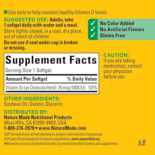 Este suplemento é livre de corantes, sabores artificiais e glúten, sendo adequado para pessoas com restrições alimentares e preferências específicas. Cuide da sua saúde de forma natural e eficaz com o Nature Made Vitamin D3 1000 IU (25 mcg).