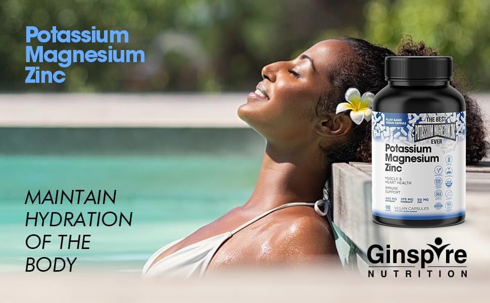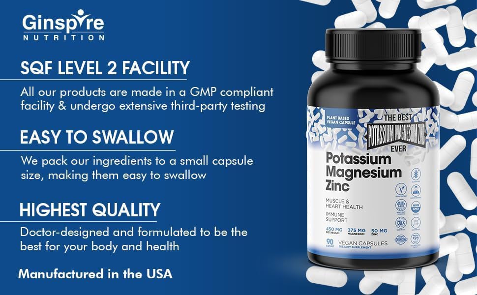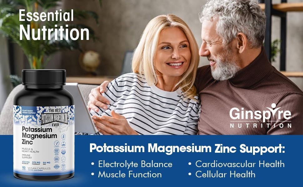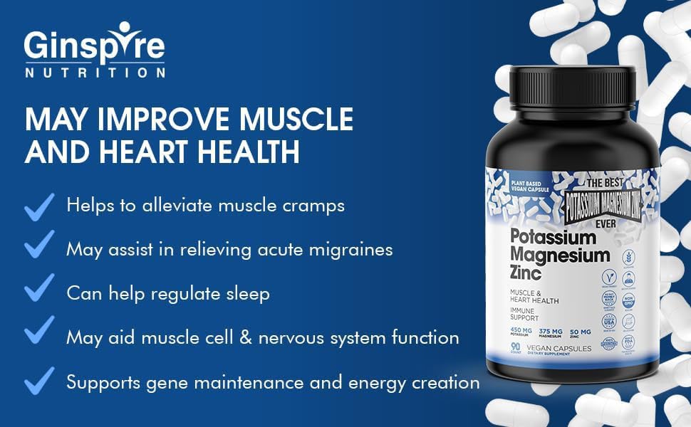 Suporte para o sistema nervoso e músculos – O Suplemento de Potássio, Magnésio e Zinco da Ginspire Nutrition pode ajudar a auxiliar a função das células musculares e do sistema nervoso. O potássio, um mineral essencial e eletrólito, ajuda a manter o equilíbrio de água e regular a pressão sanguínea, as contrações musculares, os impulsos nervosos e a digestão. Os suplementos de potássio e magnésio, minerais essenciais, desempenham um papel vital no suporte à função normal dos nervos, músculos, coração e células em geral. Também pode ajudar a combater a inflamação.*