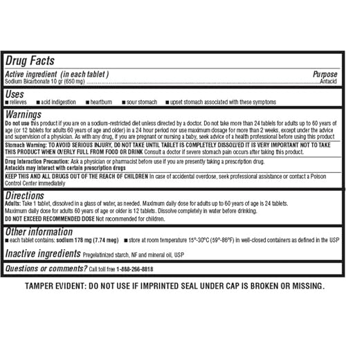 Para obter o máximo benefício, tome 1 tablet de bicarbonato de sódio USP 650mg (10 grãos) com um copo de água. Não exceda a dose recomendada. Consulte um médico antes de usar se estiver grávida, amamentando ou tiver algum problema de saúde.