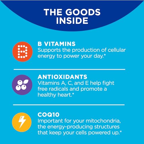 As gomas mastigáveis diárias estão repletas dos nutrientes que o seu corpo precisa. As vitaminas do complexo B e a CoQ10 apoiam a produção de energia para impulsionar o seu dia. Antioxidantes como as vitaminas A, C e E ajudam a combater os radicais livres e promovem um coração saudável.