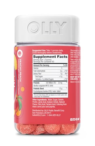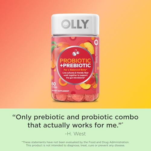 OLLY Probiotic Prebiotic Gummy, Suporte Digestivo e Saúde Intestinal, 500 Milhões de UFCs, Fibra, Suplemento Mastigável para Adultos, Pêssego, Suprimento de 60 Dias – 60 Unidades