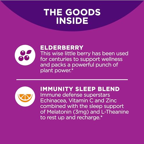 A combinação de ingredientes ativos, incluindo Elderberry, nas gomas OLLY Sleep Immunity ajuda a fortalecer o sistema imunológico, mantendo-o saudável e resistente a doenças.