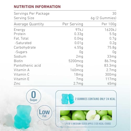 SUPER TASTY VITAMIN GUMMIES: Essas gomas de cabelo têm um sabor delicioso de sal marinho e uva verde. Elas são baixas em gordura e não contêm açúcar adicionado, levedura ou ovo. Podem conter traços de glúten, crustáceos, soja, leite, peixe e nozes.