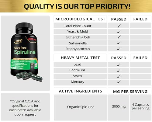 A Spirulina em Pó Orgânica em Cápsulas de 3000 mg é um dos SUPERALIMENTOS VEGANOS mais densos em nutrientes disponíveis. Com 3000 mg por porção, a spirulina proporciona excelentes resultados em termos de desintoxicação e nutrição. Ela é rica em proteínas, vitaminas, minerais, antioxidantes e clorofila. A spirulina energiza você de dentro para fora.