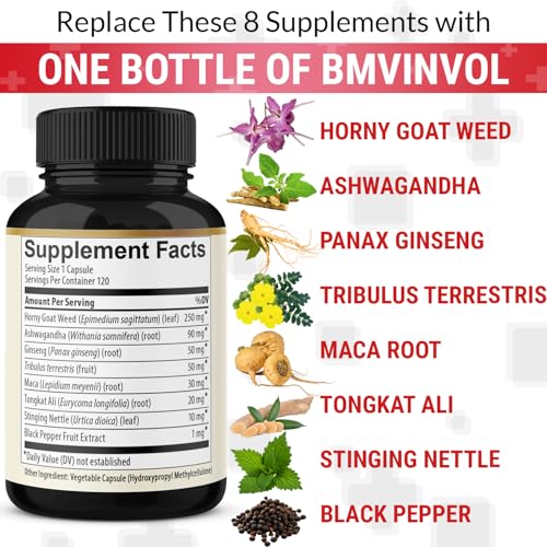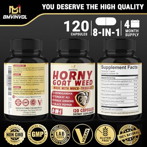 BMVINVOL Horny Goat Weed para Homens e Mulheres com Maca, Tribulus, Ginseng, Ashwagandha, Tongkat Ali – 120 Cápsulas para 4 Meses de Suprimento