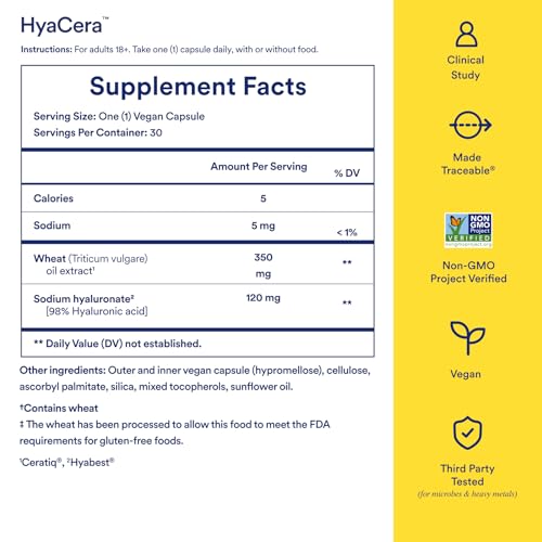 O HyaCera é certificado pelo Clean Label Project, uma certificação de segurança na indústria de suplementos. Isso significa que ele foi testado de forma independente quanto a mais de 200 contaminantes ambientais e produtos químicos nocivos, como metais pesados (incluindo chumbo, mercúrio e glifosato), resíduos de pesticidas, plastificantes e resíduos de antibióticos.