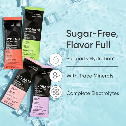 SUGAR-FREE, FLAVOR FULL: O Sports Research Hydrate é um pó de eletrólitos para misturar que é livre de açúcar sem comprometer o sabor. Escolha entre quatro sabores naturais ou um pacote variado que contém todos eles: Framboesa Limonada, Cereja Romã, Limão Limão e Maracujá.