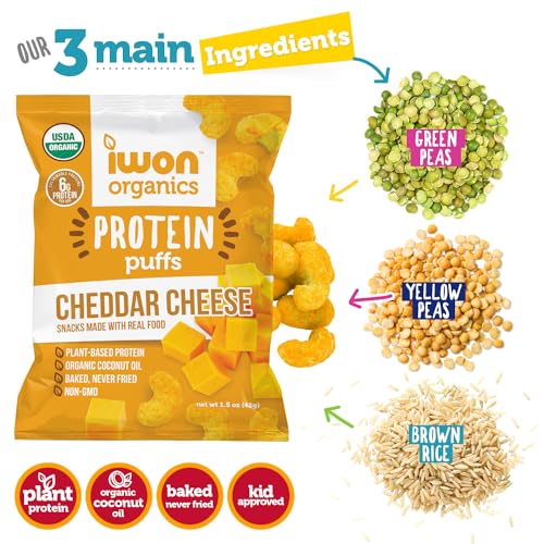 Os Puffs de Proteína com Sabor de Queijo Cheddar da IWON Organics são lanches saudáveis, orgânicos e ricos em proteínas que vão te conquistar. Com ingredientes puros e orgânicos, esses deliciosos puffs são formulados com proteínas vegetais de alta qualidade, livres de OGM, soja, glúten, óleo de semente e kosher.