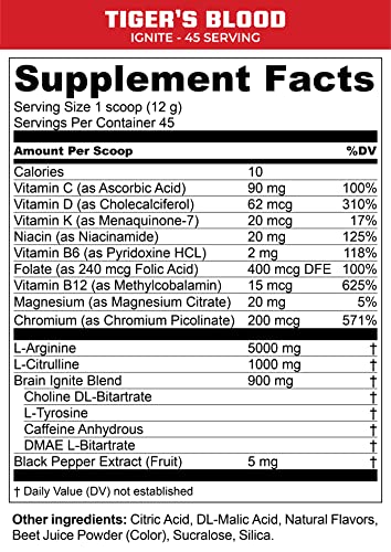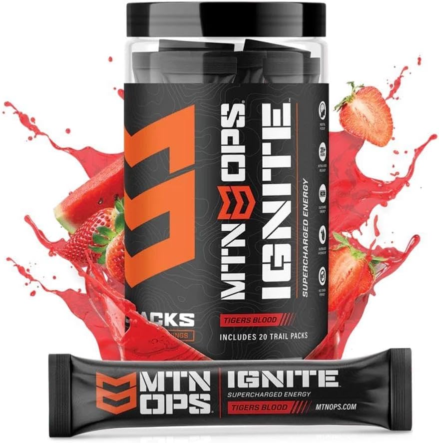 Ignite Trail Packs Supercharged Energy Drink Mix, Tiger’s Blood, é um suplemento energético da MTN OPS que oferece uma fonte de energia suave e duradoura, além de melhorar os níveis de foco por horas. Esse produto é livre de glúten e contém uma combinação exclusiva de aminoácidos, como L-Citrulina e L-Arginina, juntamente com 200mg de cafeína. Além disso, o Ignite possui uma mistura especial de nootrópicos, chamada Brain Blend, que suporta a função cognitiva, ajudando você a enfrentar o dia com mais clareza mental.