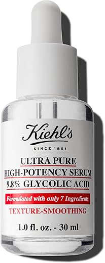 O Serum Concentrado de Ácido Glicólico Ultra Puro de Alta Potência 9,8% da Kiehl’s oferece uma esfoliação profunda, removendo as células mortas e revelando uma pele mais jovem e radiante.