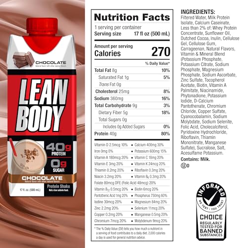 Substituição de refeição completa com 22 vitaminas e minerais: Perfeito como um lanche pré ou pós-treino, nosso Lean Body Ready-to-Drink Protein Shake também é uma refeição completa em si! Ele contém 22 vitaminas e minerais, incluindo, mas não se limitando a, vitamina A, vitamina E, biotina, riboflavina, potássio, magnésio e zinco! Nossa bebida é uma potência nutricional que ajuda o seu corpo a se recuperar do exercício, ao mesmo tempo em que combate deficiências que podem estar diminuindo seus níveis de energia!