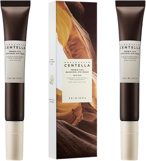 O SKIN1004 Madagascar Centella Probio-Cica Bakuchiol Eye Cream Twin Pack é um creme para os olhos formulado com ingredientes especiais para proporcionar efeitos calmantes maximizados. Contém Centella Asiatica de Madagascar fermentada, Probio-cica e TECA, que ajudam a acalmar a pele. Além disso, o Bakuchiol, um retinol vegano, cuida das áreas finas dos olhos, rugas e elasticidade da pele. A fórmula também contém colágeno de baixo peso molecular e ácido hialurônico, que ajudam na rápida absorção pela pele, recarregando sua elasticidade. O aplicador de silicone permite uma massagem suave ao redor das áreas finas dos olhos e da boca. Com uma formulação rica e rápida absorção, o creme é adequado até mesmo para peles finas. Passou por testes de irritação da pele para garantir a segurança em todos os tipos de pele, incluindo peles sensíveis.