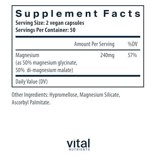 O Suplemento de Magnésio Vegan Premium da Vital Nutrients é uma fórmula combinada de Magnésio Malato e Glicinato que oferece suporte ao sono, alívio do estresse, saúde óssea e cardíaca, além de promover o relaxamento. O magnésio é necessário para mais de 600 processos corporais e suporta respostas saudáveis ao estresse*. Esta fórmula única contém magnésio malato enriquecido com ácido málico, proporcionando conforto gastrointestinal superior, e magnésio glicinato, que suporta uma melhor absorção*.