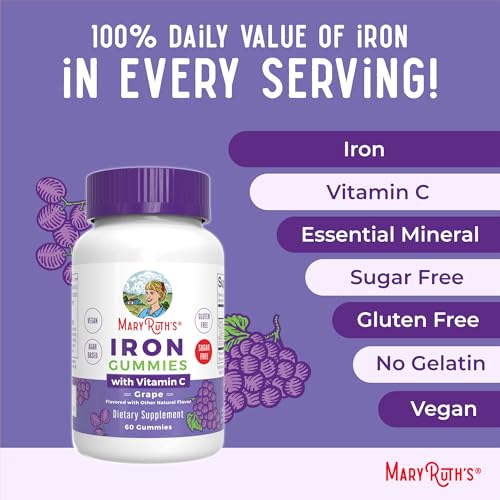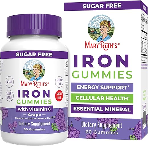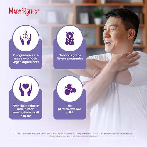 As Gomas de Ferro para Adultos da MaryRuth oferecem 100% do Valor Diário Recomendado deste mineral essencial para a saúde! Desfrute de cada porção de duas gomas saborosas de uva, veganas e sem açúcar.