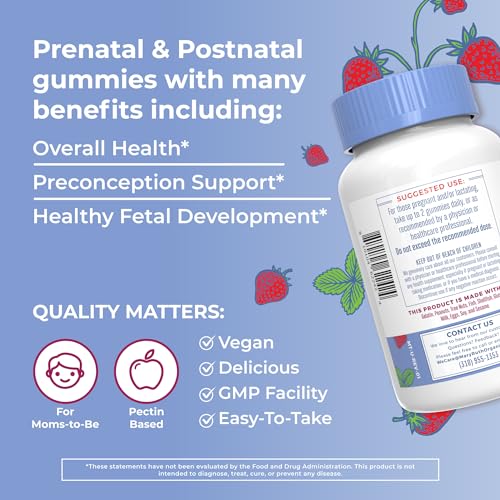 Esses multivitamínicos pré-natais contêm 800 mcg de metilfolato, uma forma de folato facilmente absorvida pelo organismo. A ingestão adequada de folato em dietas saudáveis pode reduzir o risco de defeitos no cérebro ou na medula espinhal do bebê. Além disso, essas gomas também contêm seis vitaminas do complexo B, como metil B12, além de vitaminas C, D e A, e minerais essenciais como zinco e iodo. O iodo é importante para a saúde pré-natal e pós-natal, além de auxiliar na função normal da tireoide.