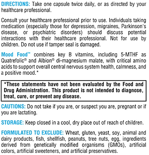 O Mood Food é formulado sem trigo, glúten, levedura, soja, produtos de origem animal e laticínios, peixe, frutos do mar, amendoim, nozes, ovos, ingredientes derivados de organismos geneticamente modificados e conservantes artificiais. Os suplementos de GABA, suplementos para o humor e suplementos para relaxamento da XYMOGEN são confiáveis por profissionais da área de saúde.